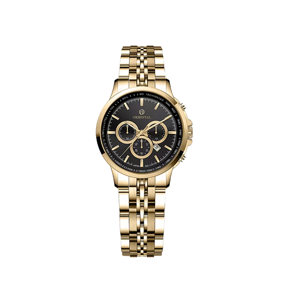 Oriental Watch For Women code O.SH022L-0002 ,a beautiful wrist watch with 022 Reference, is a Chronograph watch which has a Metallic Strap, gives you an unique style. This watch has a Golden case, Golden strap and a Black dial which has created a beautiful color combination.