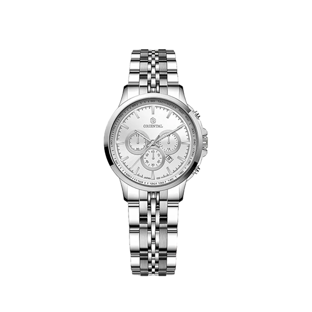 Oriental Watch For Women code O.SH022L-0004 ,a beautiful wrist watch with 022 Reference, is a Chronograph watch which has a Metallic Strap, gives you an unique style. This watch has a Steel case, Steel strap and a Silver dial which has created a beautiful color combination.