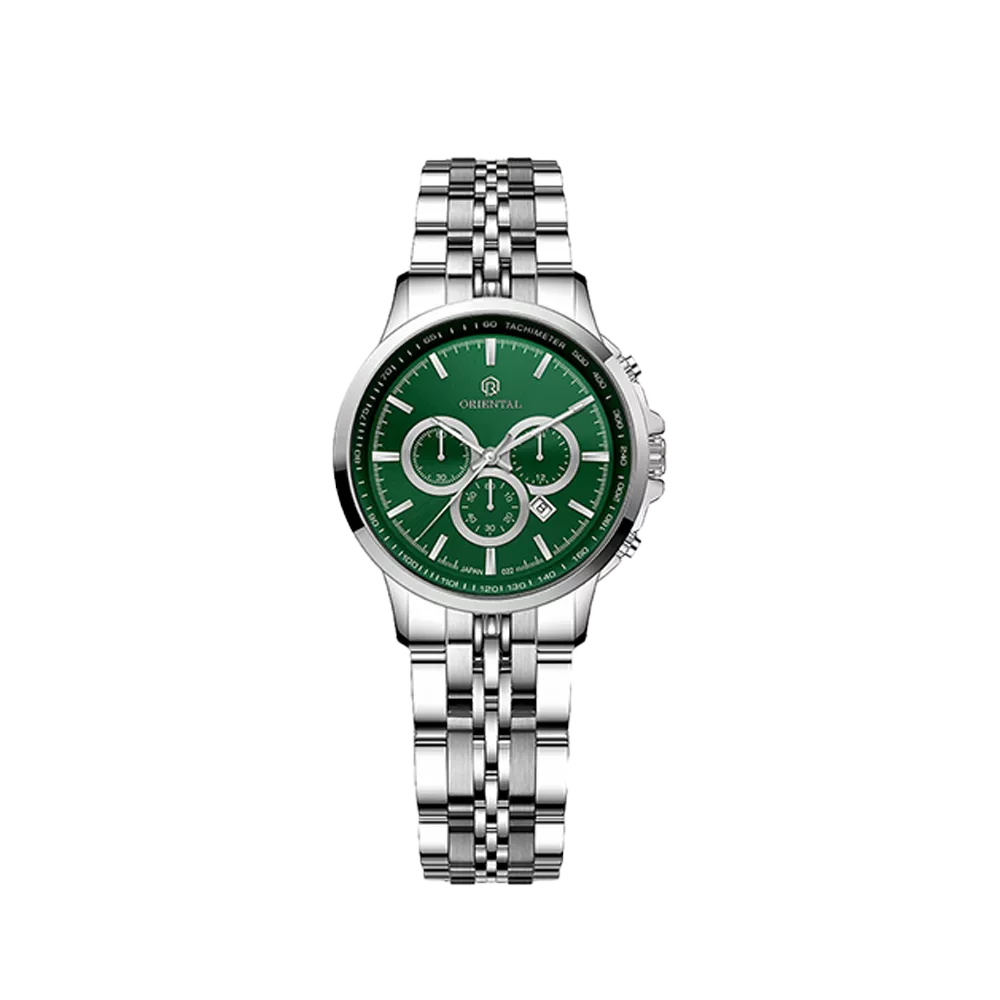 Oriental Watch For Women code O.SH022L-0009 ,a beautiful wrist watch with 022 Reference, is a Chronograph watch which has a Metallic Strap, gives you an unique style. This watch has a Steel case, Steel strap and a Green dial which has created a beautiful color combination.