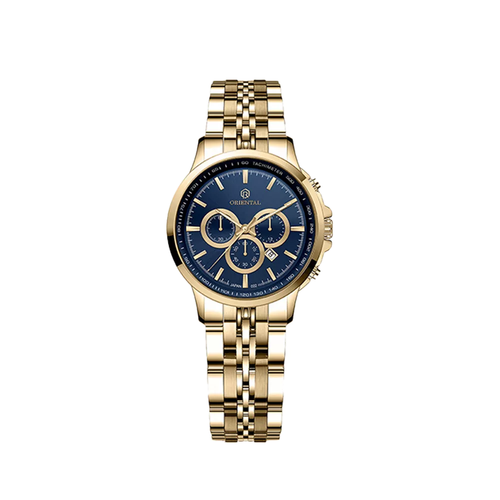 Oriental Watch For Women code O.SH022L-0061 ,a beautiful wrist watch with 022 Reference, is a Chronograph watch which has a Metallic Strap, gives you an unique style. This watch has a Golden case, Golden strap and a Dark Blue dial which has created a beautiful color combination.
