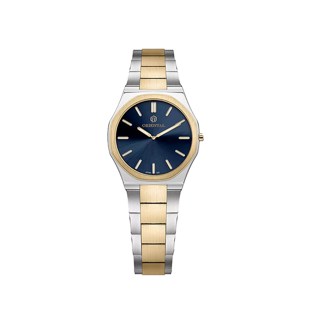 Oriental Watch For Women code O.SH025L-0101 ,a beautiful wrist watch with 025 Reference, is a Classic watch which has a Metallic Strap, gives you an unique style. This watch has a Golden Steel case, Golden Steel strap and a Dark Blue dial which has created a beautiful color combination.