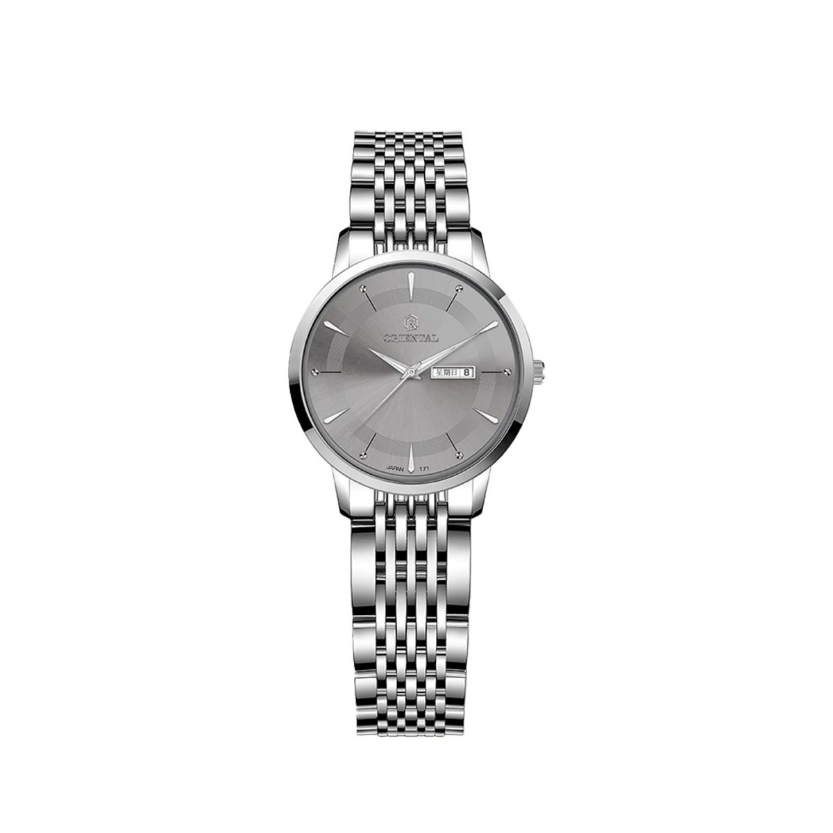 Oriental Watch For Women code O.SH171L-0025 ,a beautiful wrist watch with 171 Reference, is a Classic watch which has a Metallic Strap, gives you an unique style. This watch has a Steel case, Steel strap and a Gray dial which has created a beautiful color combination.