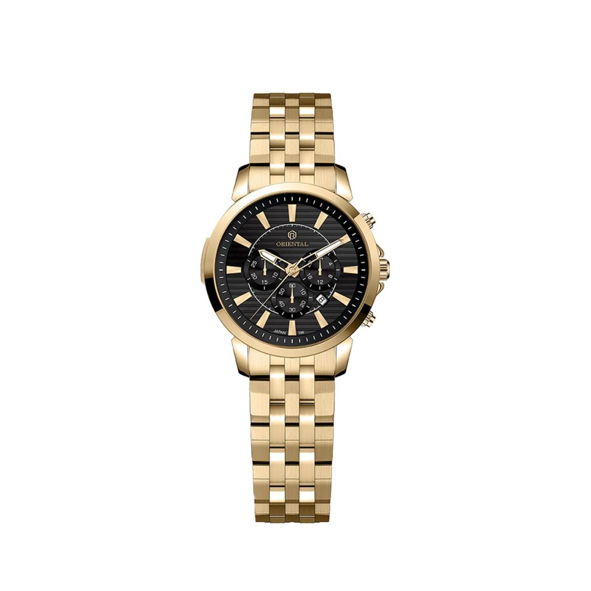 Oriental Watch Women Watch code O.SH196L-0002 ,a beautiful wrist watch with 196 Reference, is a Chronograph watch which has a Metallic Strap, gives you an unique style. This watch has a Golden case, Golden strap and a Black dial which has created a beautiful color combination.