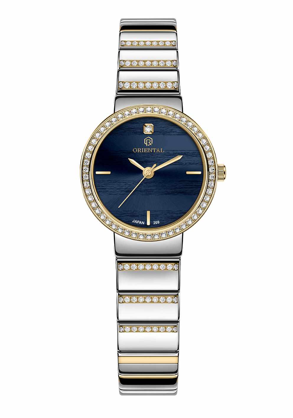 Oriental Watch For Women code O.SH209L-0110, a beautiful wrist watch with 209 Reference, is a Classic watch which has a Metallic Strap, gives you an unique style. This watch has a Golden Steel case, Golden Steel strap and a Dark Blue dial which has created a beautiful color combination.