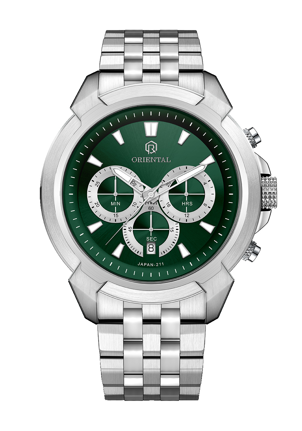 Oriental Watch For Men code O.SH211G-0009, a beautiful wrist watch with 211 Reference, is a Chronograph watch which has a Metallic Strap, gives you an unique style. This watch has a Steel case, Steel strap and a Green dial which has created a beautiful color combination