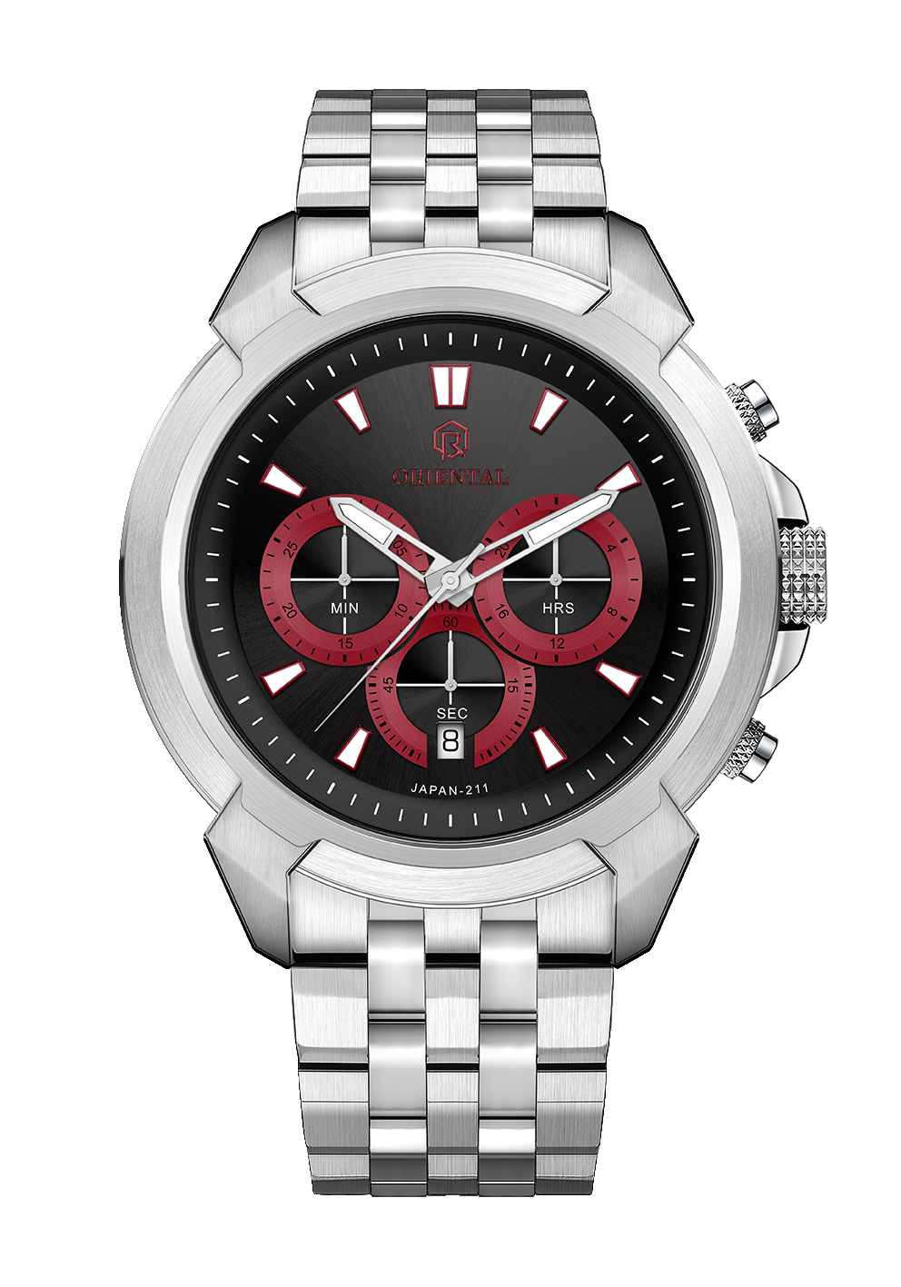 Oriental Watch For Men code O.SH211G-1005, a beautiful wrist watch with 211 Reference, is a Chronograph watch which has a Metallic Strap, gives you an unique style. This watch has a Steel case, Steel strap and a Black dial which has created a beautiful color combination