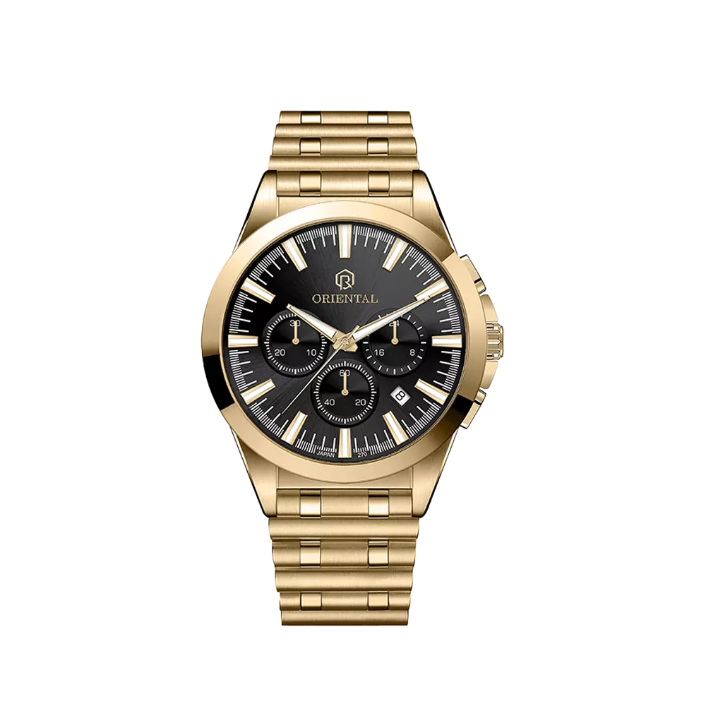 Oriental Watch For Men code O.SH270G-0002 ,a beautiful wrist watch with 270 Reference, is a Chronograph watch which has a Metallic Strap, gives you an unique style. This watch has a Golden case, Golden strap and a Black dial which has created a beautiful color combination.