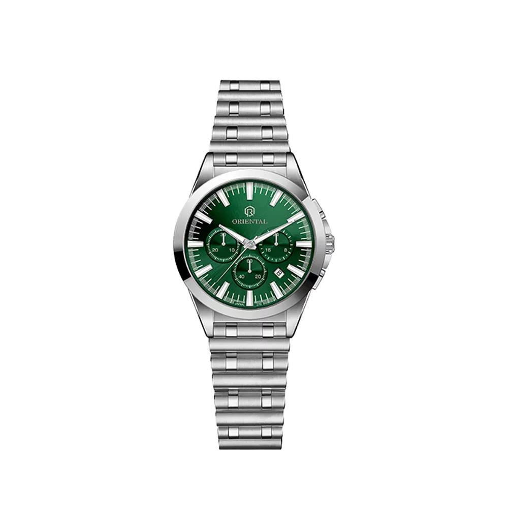Oriental Watch For Women code O.SH270L-0009 ,a beautiful wrist watch with 270 Reference, is a Chronograph watch which has a Metallic Strap, gives you an unique style. This watch has a Steel case, Steel strap and a Green dial which has created a beautiful color combination.