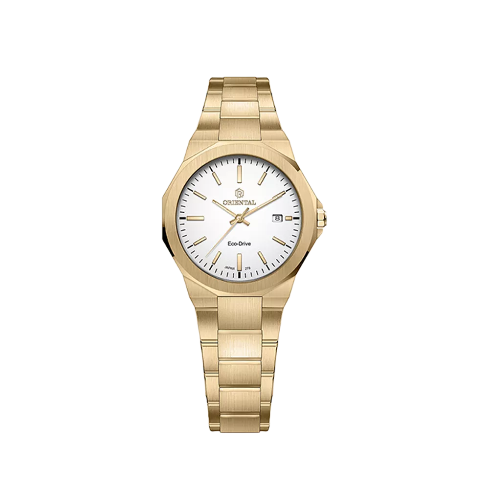 Oriental Watch For Women code O.SH278L-0001 ,a beautiful wrist watch with 278 Reference, is a Classic – Ecodrive watch which has a Metallic Strap, gives you an unique style. This watch has a Golden case, Golden strap and a Silver dial which has created a beautiful color combination.