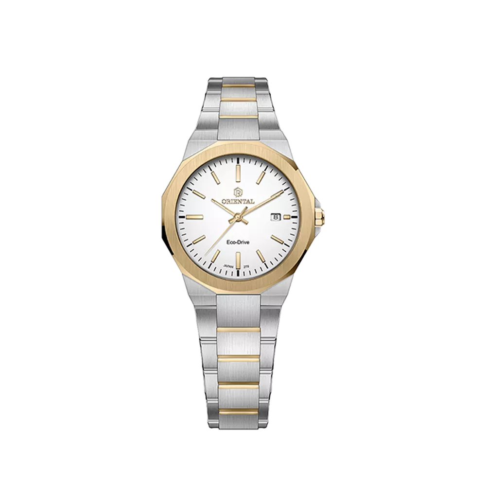 Oriental Watch For Women code O.SH278L-0003 ,a beautiful wrist watch with 278 Reference, is a Classic – Ecodrive watch which has a Metallic Strap, gives you an unique style. This watch has a Golden Steel case, Golden Steel strap and a Silver dial which has created a beautiful color combination.