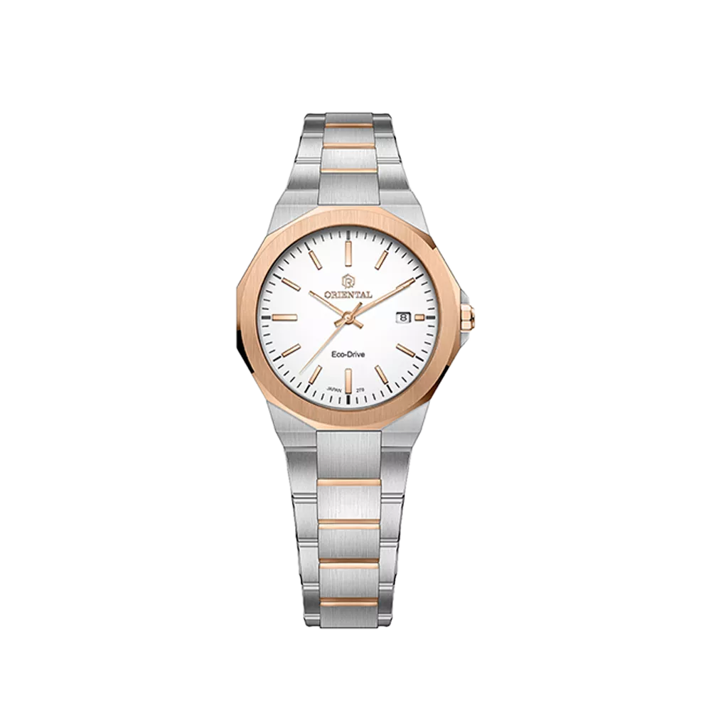 Oriental Watch For Women code O.SH278L-0006 ,a beautiful wrist watch with 278 Reference, is a Classic – Ecodrive watch which has a Metallic Strap, gives you an unique style. This watch has a Rosegold Steel case, Rosegold Steel strap and a Silver dial which has created a beautiful color combination.
