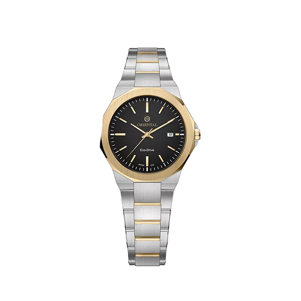 Oriental Watch For Women code O.SH278L-0023 ,a beautiful wrist watch with 278 Reference, is a Classic – Ecodrive watch which has a Metallic Strap, gives you an unique style. This watch has a Golden Steel case, Golden Steel strap and a Black dial which has created a beautiful color combination.