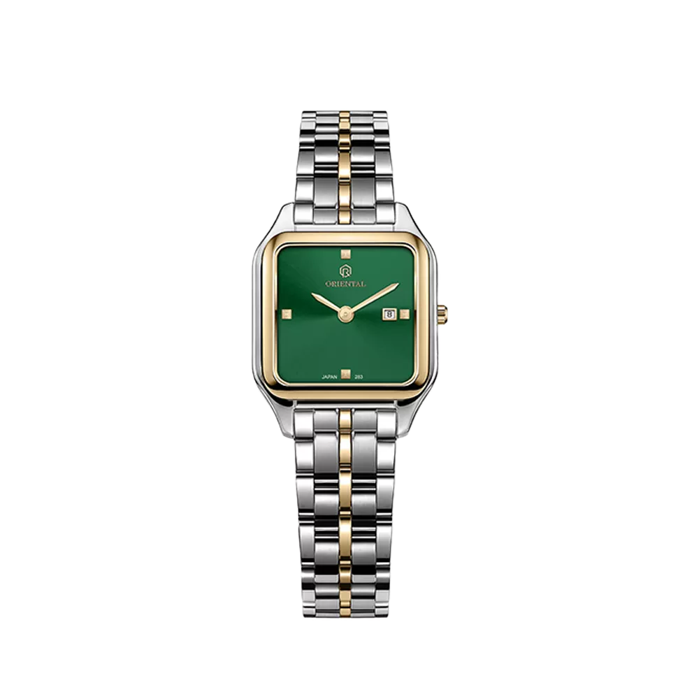 Oriental Watch For Women code O.SH283L-0100 ,a beautiful wrist watch with 283 Reference, is a Classic watch which has a Metallic Strap, gives you an unique style. This watch has a Golden Steel case, Golden Steel strap and a Green dial which has created a beautiful color combination.