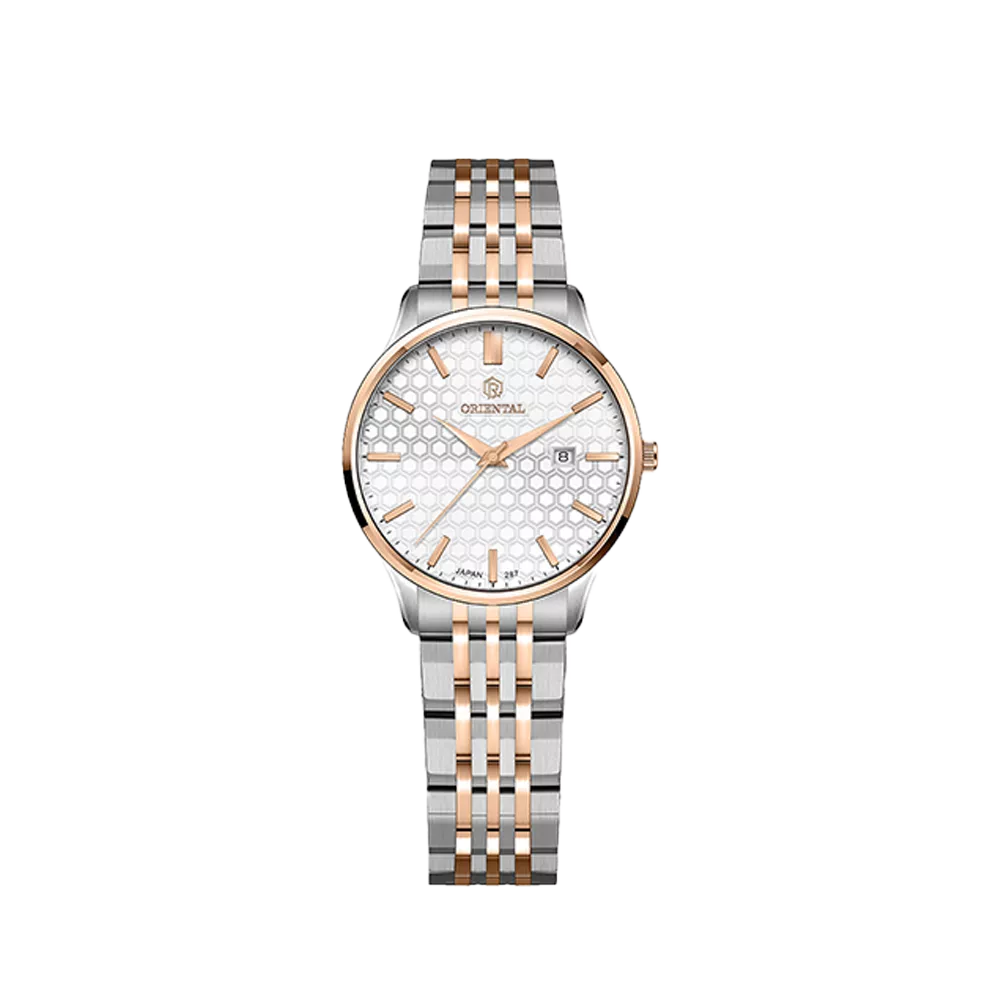 Oriental Watch For Women code O.SH287L-0006 ,a beautiful wrist watch with 287 Reference, is a Classic watch which has a Metallic Strap, gives you an unique style. This watch has a Rosegold Steel case, Rosegold Steel strap and a Silver dial which has created a beautiful color combination.