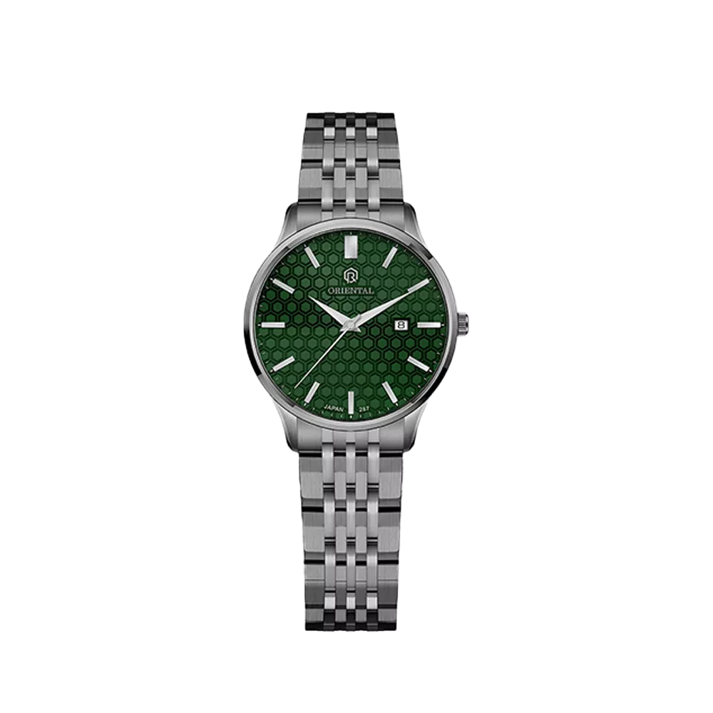 Oriental Watch For Women code O.SH287L-0012 ,a beautiful wrist watch with 287 Reference, is a Classic watch which has a Metallic Strap, gives you an unique style. This watch has a Smoke case, Smoke strap and a Green dial which has created a beautiful color combination.