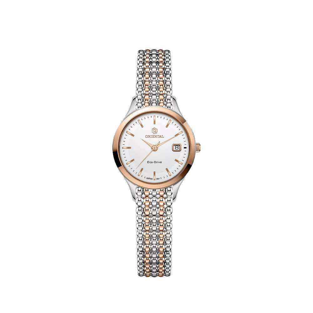 Oriental Watch For Women code O.SH291L-0006 ,a beautiful wrist watch with 291 Reference, is a Classic – Ecodrive watch which has a Metallic Strap, gives you an unique style. This watch has a Rosegold Steel case, Rosegold Steel strap and a Silver dial which has created a beautiful color combination.