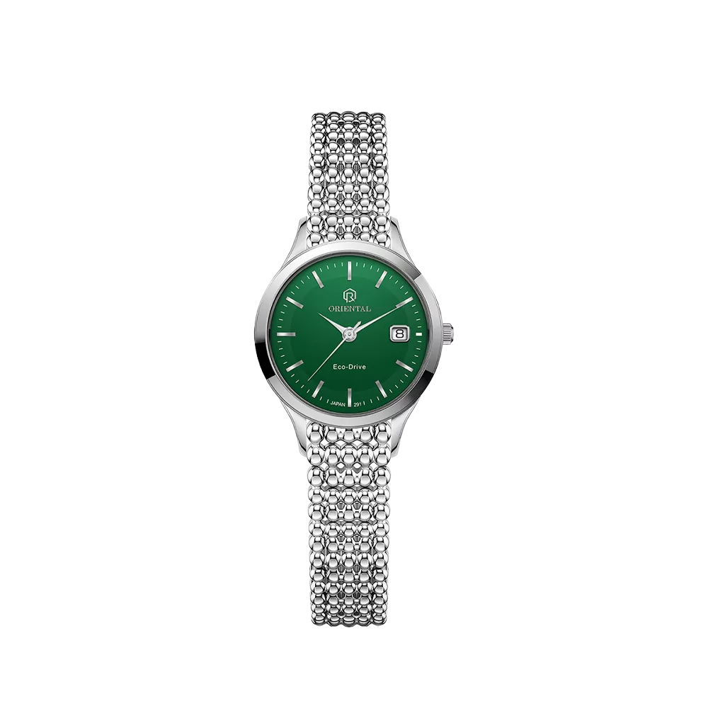 Oriental Watch For Women code O.SH291L-0009 ,a beautiful wrist watch with 291 Reference, is a Classic – Ecodrive watch which has a Metallic Strap, gives you an unique style. This watch has a Steel case, Steel strap and a Green dial which has created a beautiful color combination.