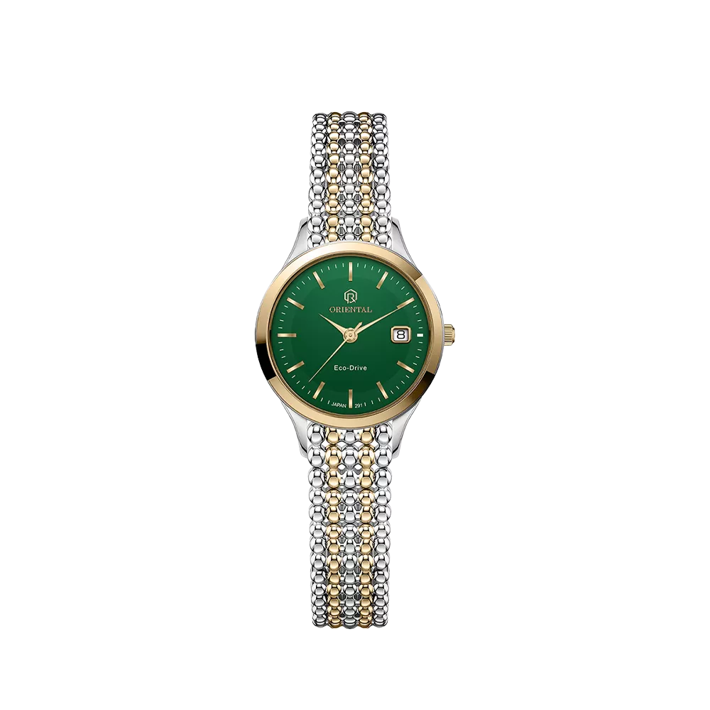 Oriental Watch For Women code O.SH291L-0100 ,a beautiful wrist watch with 291 Reference, is a Classic – Ecodrive watch which has a Metallic Strap, gives you an unique style. This watch has a Golden Steel case, Golden Steel strap and a Green dial which has created a beautiful color combination.