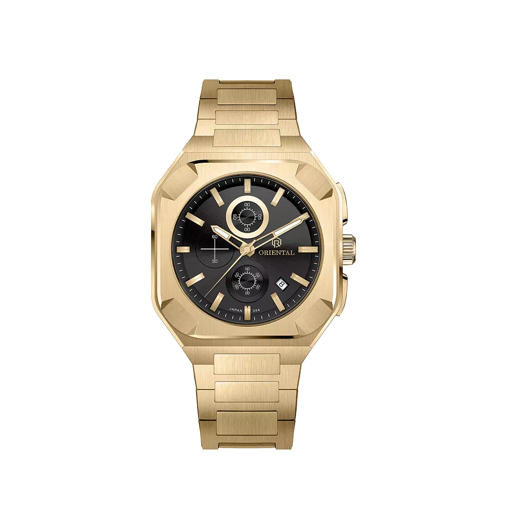 Oriental Watch For Men code O.SH304G-0002 ,a beautiful wrist watch with 304 Reference, is a Chronograph watch which has a Metallic Strap, gives you an unique style. This watch has a Golden case, Golden strap and a Black dial which has created a beautiful color combination.