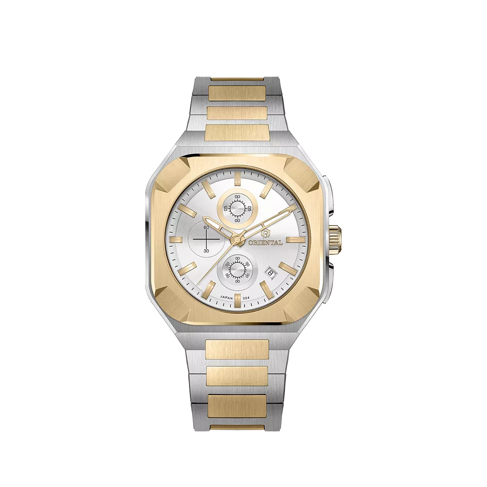Oriental Watch For Men code O.SH304G-0003 ,a beautiful wrist watch with 304 Reference, is a Chronograph watch which has a Metallic Strap, gives you an unique style. This watch has a Golden Steel case, Golden Steel strap and a Silver dial which has created a beautiful color combination.