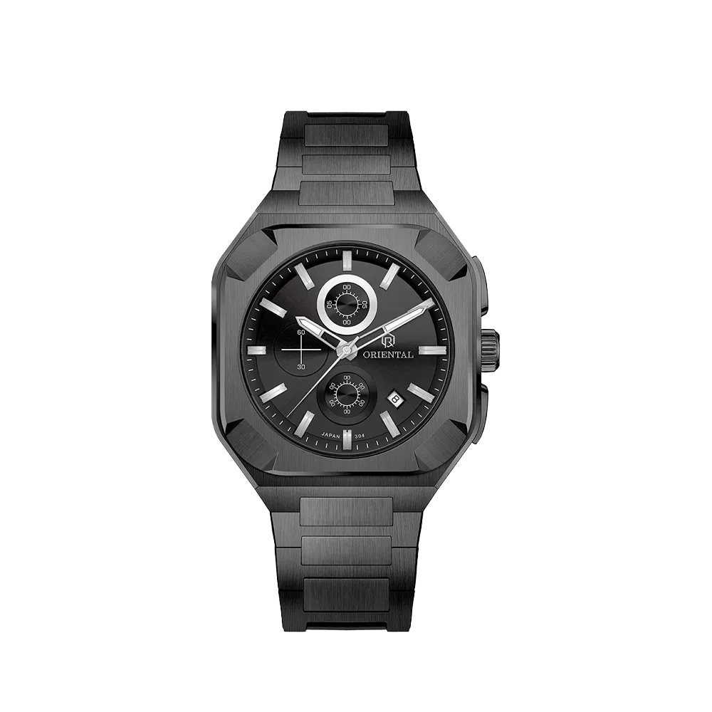 Oriental Watch For Men code O.SH304G-0014 ,a beautiful wrist watch with 304 Reference, is a Chronograph watch which has a Metallic Strap, gives you an unique style. This watch has a Black case, Black strap and a Black dial which has created a beautiful color combination.