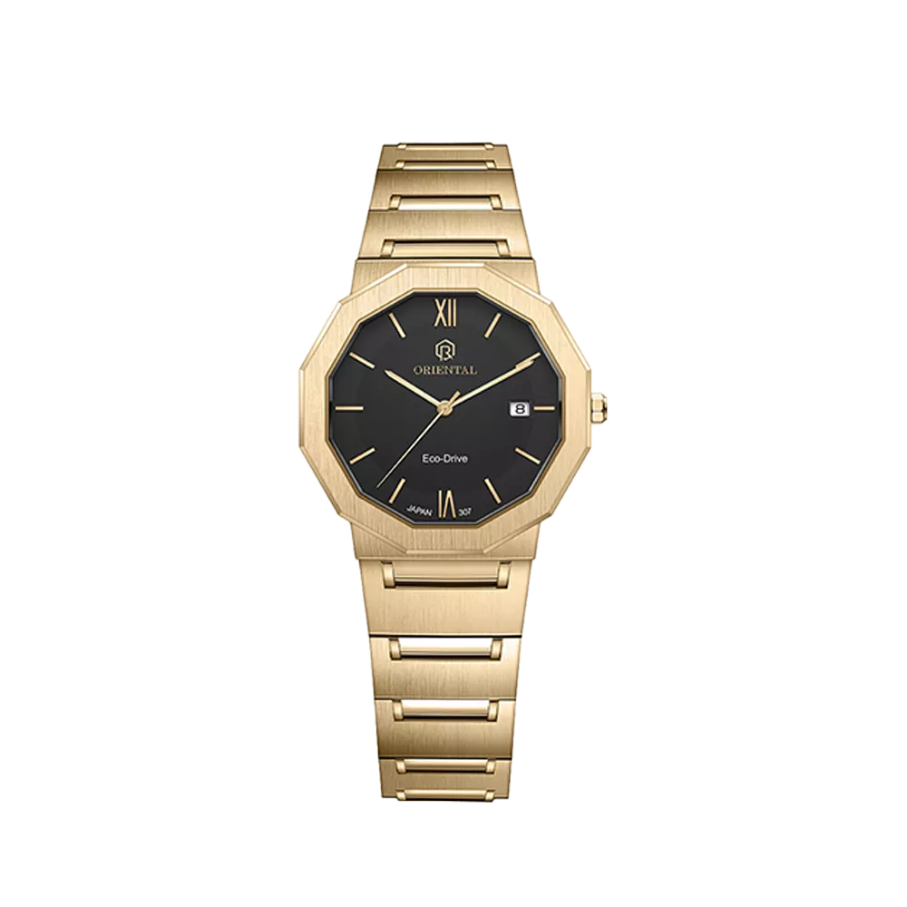 Oriental Watch For Women code O.SH307L-0002 ,a beautiful wrist watch with 307 Reference, is a Classic – Ecodrive watch which has a Metallic Strap, gives you an unique style. This watch has a Golden case, Golden strap and a Black dial which has created a beautiful color combination.