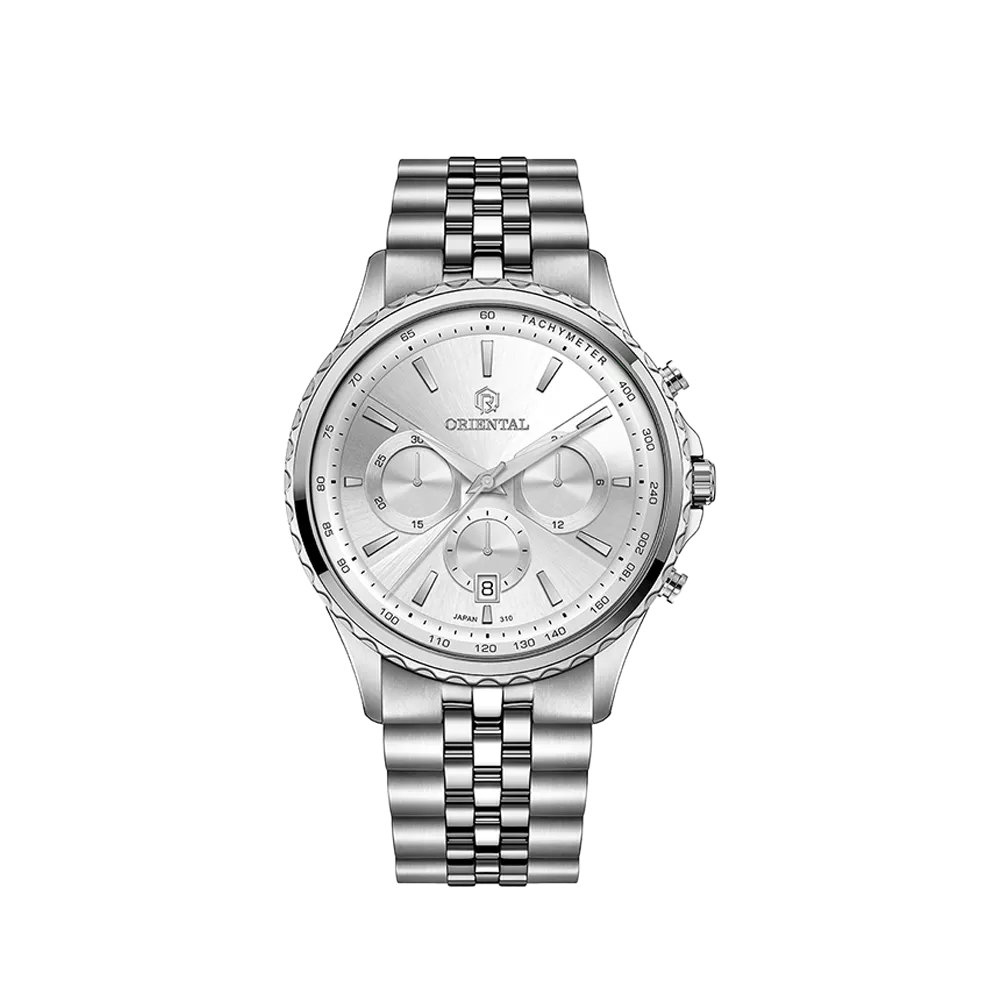 Oriental Watch For Men code O.SH310G-0004 ,a beautiful wrist watch with 310 Reference, is a Chronograph watch which has a Metallic Strap, gives you an unique style. This watch has a Steel case, Steel strap and a Silver dial which has created a beautiful color combination.