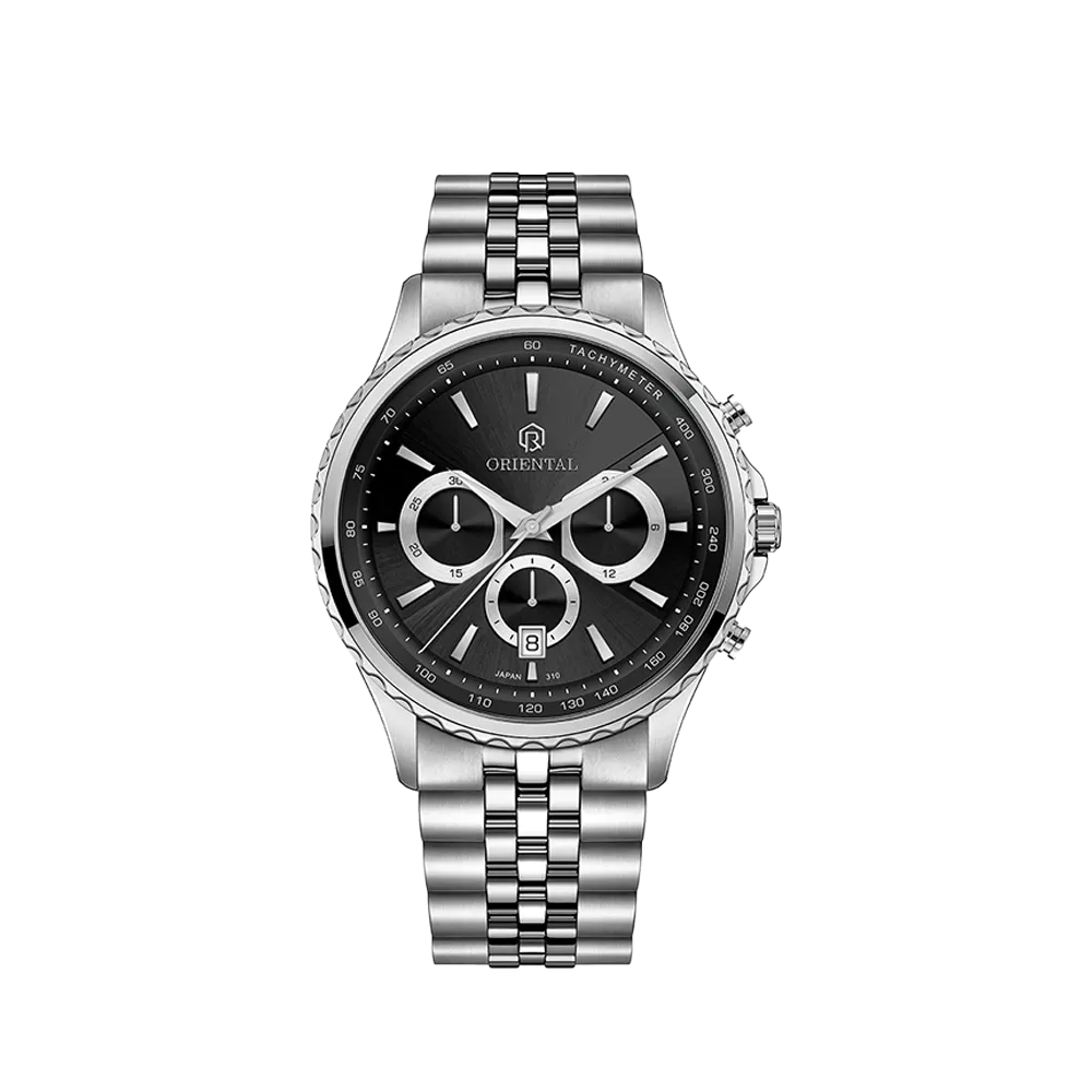 Oriental Watch For Men code O.SH310G-0005 ,a beautiful wrist watch with 310 Reference, is a Chronograph watch which has a Metallic Strap, gives you an unique style. This watch has a Steel case, Steel strap and a Black dial which has created a beautiful color combination.