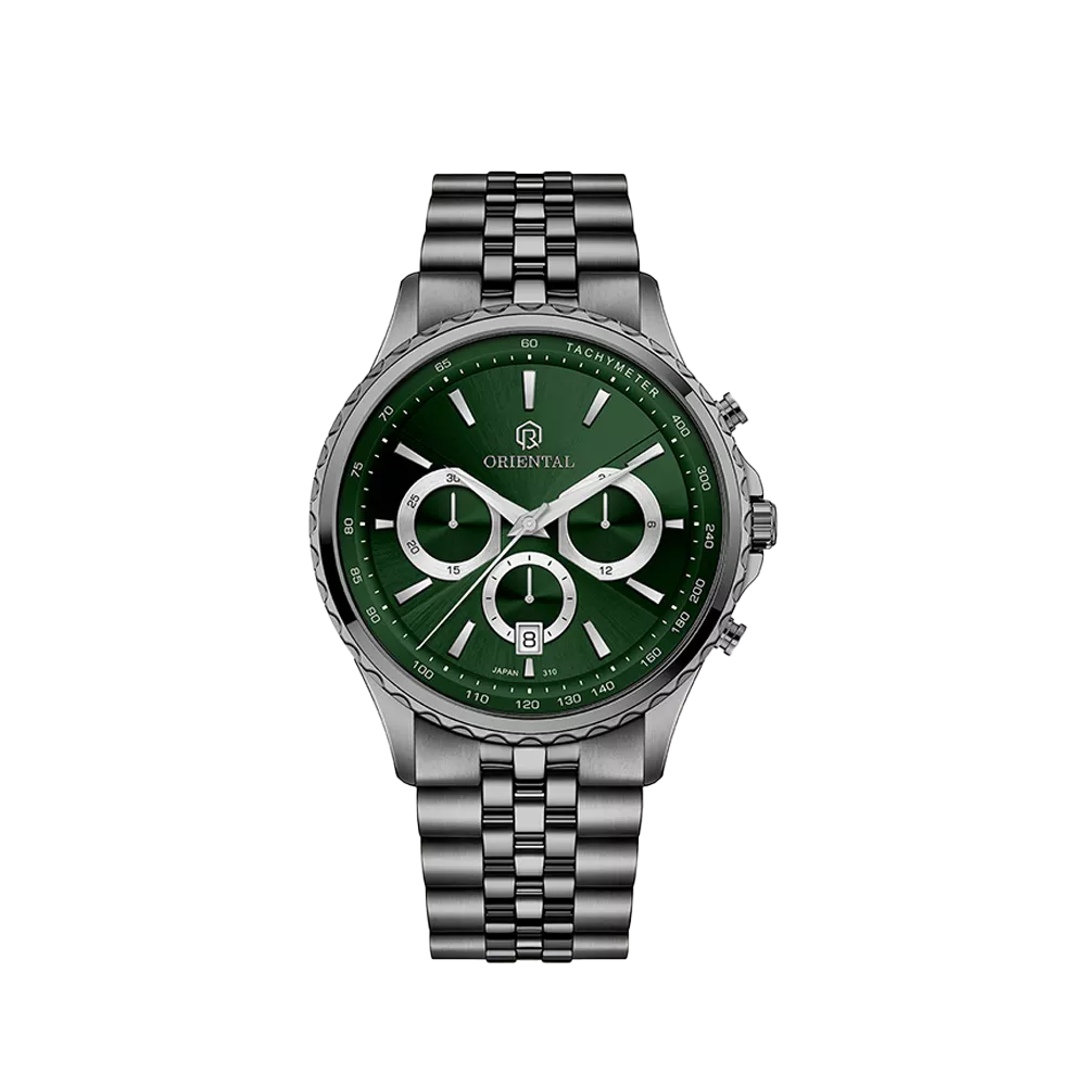 Oriental Watch For Men code O.SH310G-0012 ,a beautiful wrist watch with 310 Reference, is a Chronograph watch which has a Metallic Strap, gives you an unique style. This watch has a Smoke case, Smoke strap and a Green dial which has created a beautiful color combination.