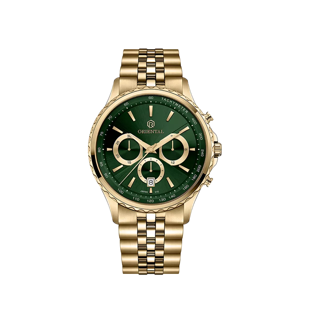 Oriental Watch For Men code O.SH310G-0042 ,a beautiful wrist watch with 310 Reference, is a Chronograph watch which has a Metallic Strap, gives you an unique style. This watch has a Golden case, Golden strap and a Green dial which has created a beautiful color combination.