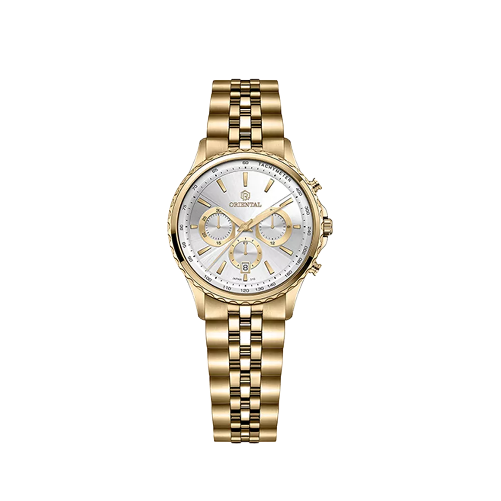 Oriental Watch For Women code O.SH310L-0001 ,a beautiful wrist watch with 310 Reference, is a Chronograph watch which has a Metallic Strap, gives you an unique style. This watch has a Golden case, Golden strap and a Silver dial which has created a beautiful color combination.