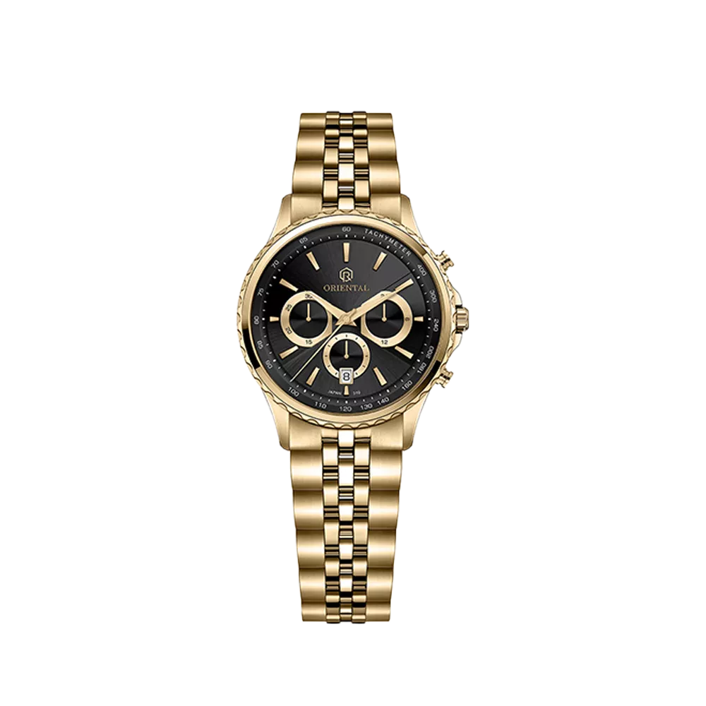 Oriental Watch For Women code O.SH310L-0002 ,a beautiful wrist watch with 310 Reference, is a Chronograph watch which has a Metallic Strap, gives you an unique style. This watch has a Golden case, Golden strap and a Black dial which has created a beautiful color combination.