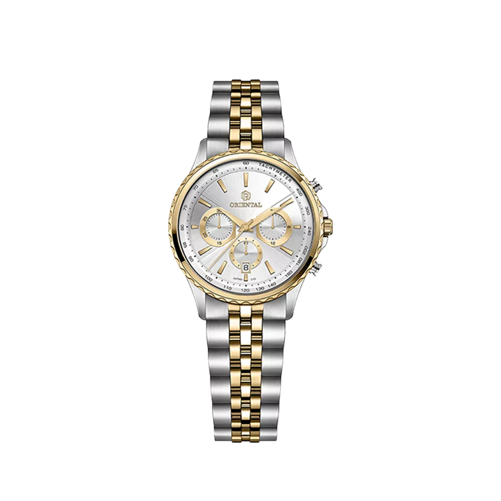 Oriental Watch For Women code O.SH310L-0003 ,a beautiful wrist watch with 310 Reference, is a Chronograph watch which has a Metallic Strap, gives you an unique style. This watch has a Golden Steel case, Golden Steel strap and a Silver dial which has created a beautiful color combination.