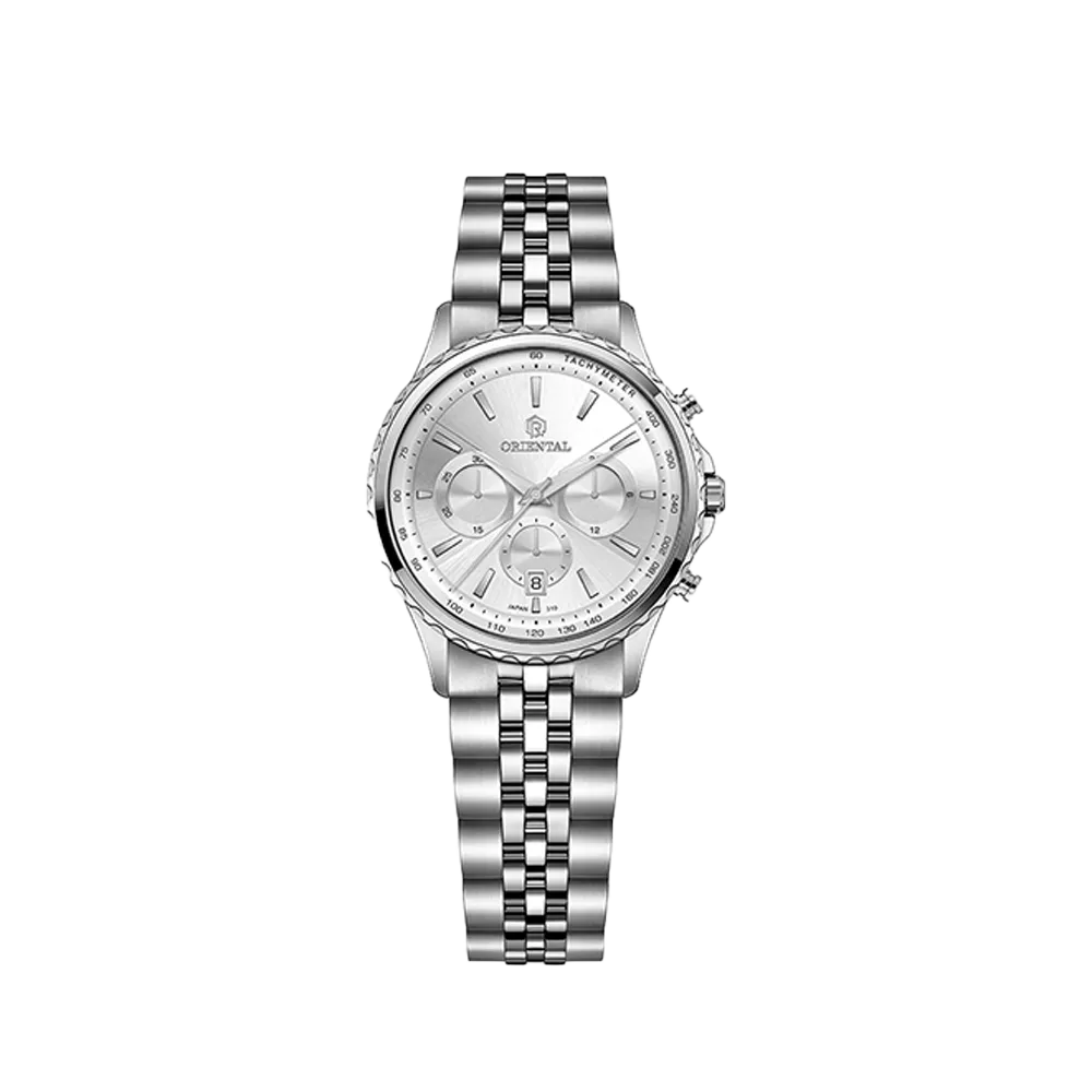 Oriental Watch For Women code O.SH310L-0004 ,a beautiful wrist watch with 310 Reference, is a Chronograph watch which has a Metallic Strap, gives you an unique style. This watch has a Steel case, Steel strap and a Silver dial which has created a beautiful color combination.