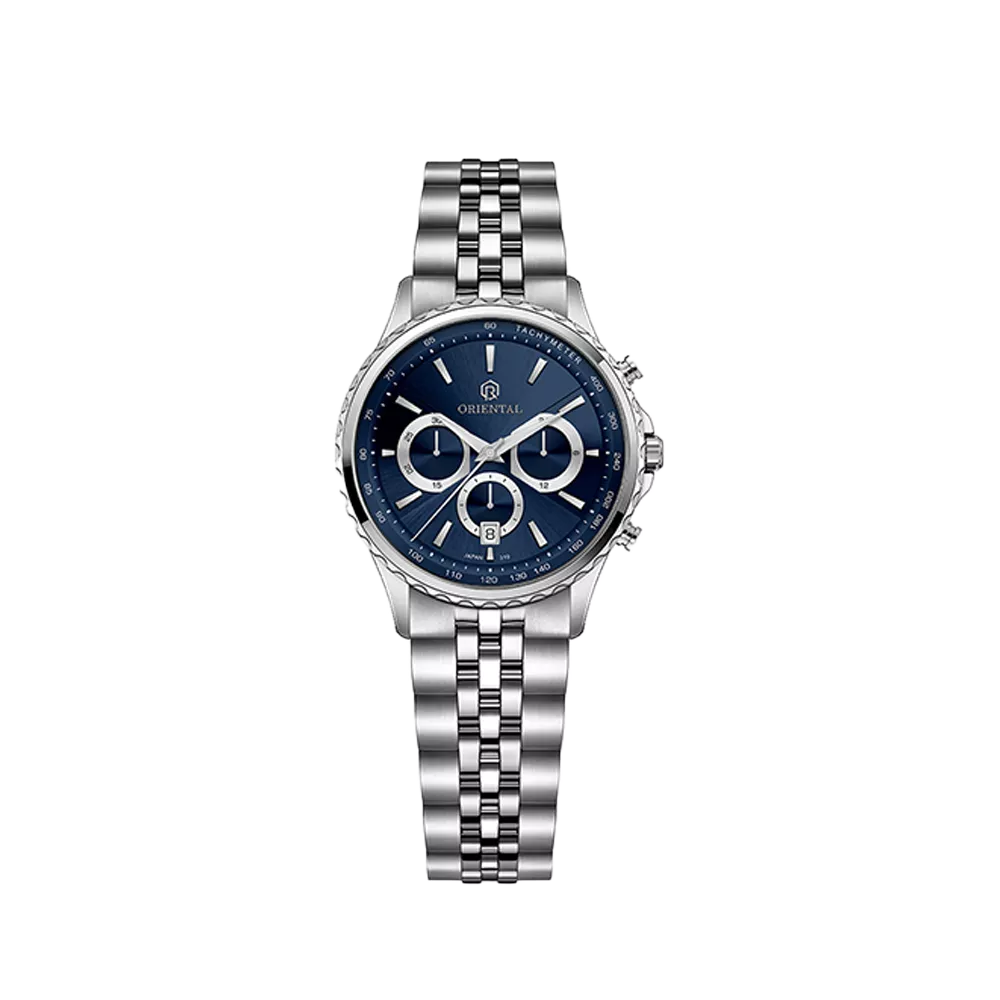 Oriental Watch For Women code O.SH310L-0010 ,a beautiful wrist watch with 310 Reference, is a Chronograph watch which has a Metallic Strap, gives you an unique style. This watch has a Steel case, Steel strap and a Blue dial which has created a beautiful color combination.
