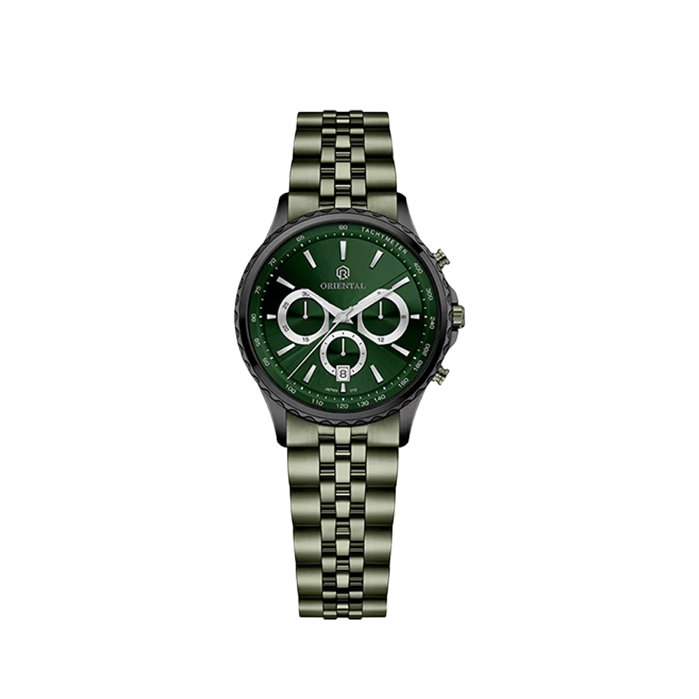 Oriental Watch For Women code O.SH310L-0051 ,a beautiful wrist watch with 310 Reference, is a Chronograph watch which has a Metallic Strap, gives you an unique style. This watch has a Black case, Green strap and a Green dial which has created a beautiful color combination.