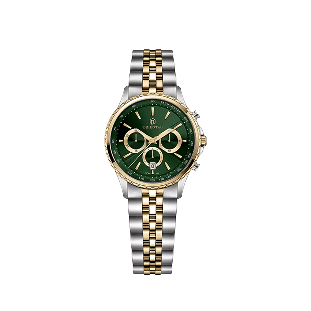 Oriental Watch For Women code O.SH310L-0100 ,a beautiful wrist watch with 310 Reference, is a Chronograph watch which has a Metallic Strap, gives you an unique style. This watch has a Golden Steel case, Golden Steel strap and a Green dial which has created a beautiful color combination.