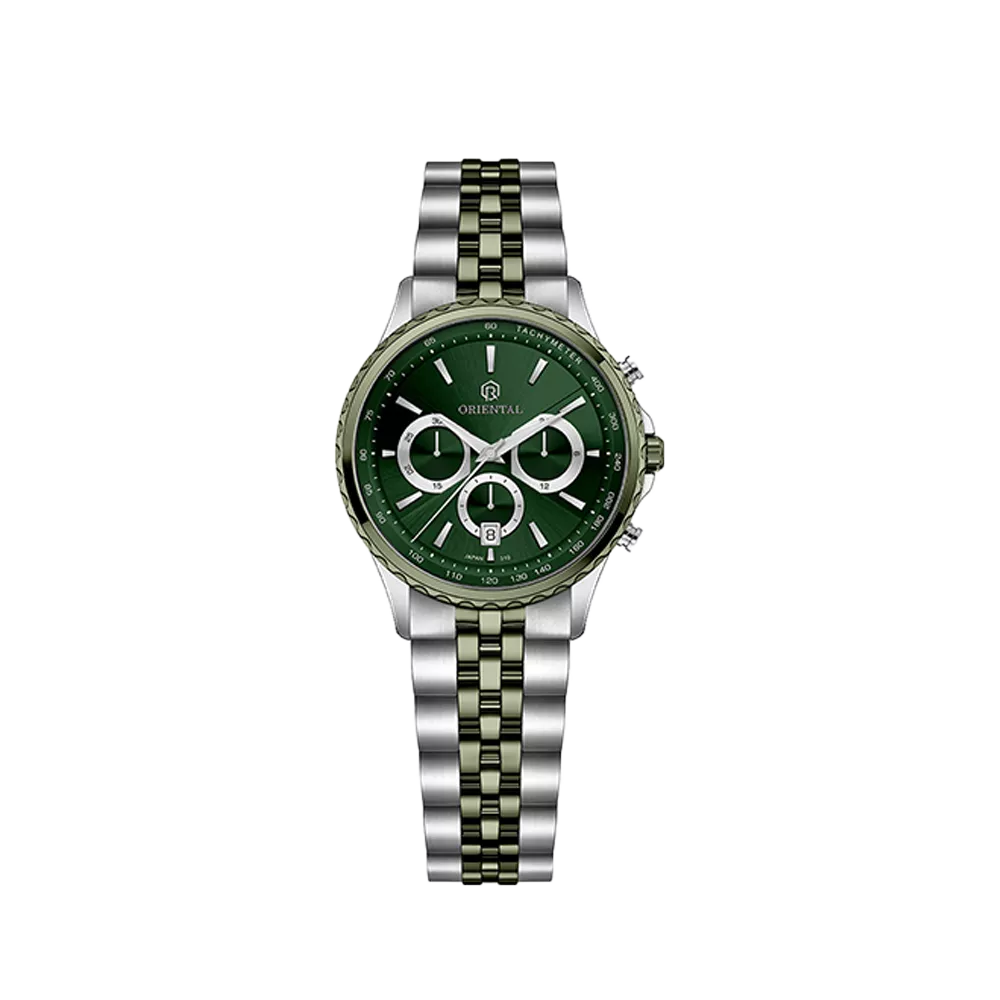 Oriental Watch For Women code O.SH310L-0840 ,a beautiful wrist watch with 310 Reference, is a Chronograph watch which has a Metallic Strap, gives you an unique style. This watch has a Green Steel case, Green Steel strap and a Green dial which has created a beautiful color combination.